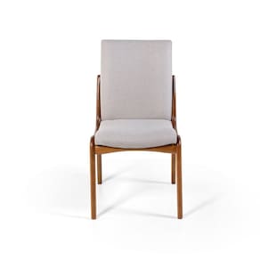 A cadeira é toda estofada em espuma de densidade 28, revestida com tecido de linho, trazendo durabilidade, toque macio e conforto à cadeira. É fabricada com madeira maciça Lyptus Grandis, com acabamento em selador nogueira fosco.