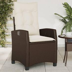 - Cadeira: - - Cor: marrom.- - Material: rattan PE, aço com revestimento em pó.- - Dimensões na posição sentada: 57 x 66 x 93 cm (L x P x A) .- - Dimensões na posição deitada: 57 x 90 x 83 cm (L x P x A) .- - Tamanho do assento: 48 x 54 cm (L x P) - Altura do assento do chão: 43,5 cm.- - Braço Altura do descanso em relação ao chão: 62 cm.- - Capacidade máxima de carga (por assento): 110 kg.- - Resistente aos raios UV .- - Montagem necessária: Sim- - Almofada: - Cor: branco creme.- - Material da capa: tecido (100% poliéster) .- - Enchimento da almofada do assento: espuma.- - Enchimento da almofada traseira: fibra de algodão.- - Dimensões da almofada do assento: 48 x 54 x 3 cm (L x P x A) .- - Dimensões da almofada traseira: 48 x 67 x 11 cm (L x P x A) .- - - - O pacote inclui: - - 1 x cadeira reclinável de jardim.- - 1 x almofada de assento com capa removível e lavável.- - 1 x almofada traseira. -