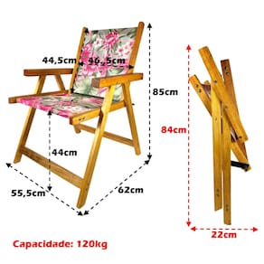 - Medidas da cadeira aberta: 62cm (Comp.) x 55,5cm (Larg.) x 85cm (Alt.)