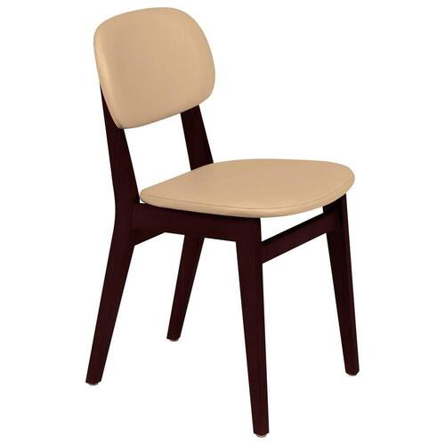 Cadeira sem braços de madeira tauarí.Acabamento com verniz tingido de castanho escuro.Assento e encosto estofado em couríssimo bege.Produto entregue montado.