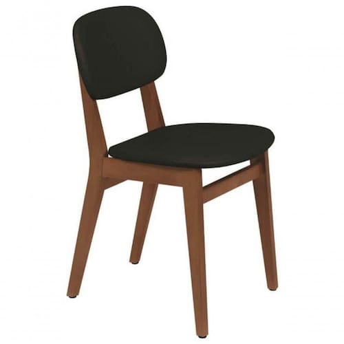 Cadeira sem braços de madeira tauarí.Acabamento com verniz tingido de amêndoa. Assento e encosto estofado em couríssimo preto.Produto é entregue montado. Ean: 7896403766062