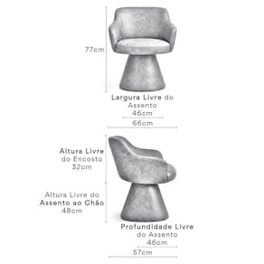 Medidas Altura Total: 77 cm Largura: 66 cm Profundidade: 57 cm Peso: 15 kg Outras Medidas: Altura do Encosto: 32 cm Altura do Assento ao Chão: 48 cm Largura do Assento: 46 cm Profundidade do Assento: 46 cm