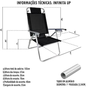A Cadeira Infinita Up ZAKA foi desenvolvida para proporcionar mais conforto nos seus momentos de lazer, é uma cadeira mais alta do chão, com 5 posições diferentes, possui estrutura e dobradiças em alumínio, garantindo maior durabilidade. É indicada para pessoas com até 120kg. Fabricada em alumínio de alta resistência e que não enferruja, tecido BMDNET, soldado eletronicamente, sem costuras. Braços em alumínio com 5 posições. Atende público exigente, com alto padrão de qualidade. Além disso, é ótima para tomar sol tanto na praia como piscina, proporcionando ótimos momentos de lazer. Diferencial: a marca ZAKA é reconhecida por ser uma marca de qualidade. Todos os produtos são revisados e testados. A cadeira Infinita Up é muito mais resistente. Utilizamos os melhores componentes e insumos do mercado.