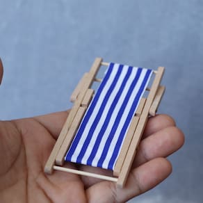 Tamanho: 11 cm de comprimento, 5,5 cm de largura Material: tecido de madeira Peso: 7 g Atenção: não é um brinquedo para crianças menores de 3 anos; evite peças pequenas que possam causar risco de asfixia. Este produto é apenas um modelo de brinquedo e não se destina ao uso na vida real. Um complemento perfeito para casas de bonecas em escala 1/12, criando uma cena de praia aconchegante e divertida para suas bonecas. Feita de madeira e tecido duráveis, esta cadeira de praia dobrável apresenta um design clássico listrado em azul, perfeito para configurações em miniatura. Ótima para brincadeiras criativas, esta peça de mobiliário em miniatura aprimora a brincadeira de fingir em casas de bonecas, dando vida ao seu pequeno mundo.