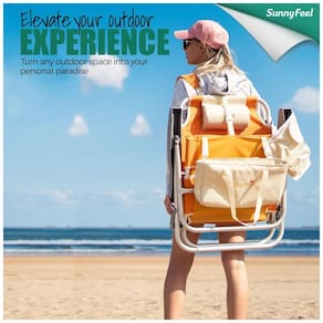 Uma cadeira de praia tipo mochila versátil, perfeita para ser usada como cadeira de acampamento, cadeira dobrável, cadeira de gramado, cadeira de viagem, cadeira de praia e muito mais. Adequada para aventuras ao ar livre, pesca, piqueniques, eventos esportivos, viagens de carro ou simplesmente relaxar no quintal, cabine, varanda, ou festas no gramado do pátio. A cadeira de campismo SunnyFeel é um acessório essencial para aprimorar suas experiências de camping.