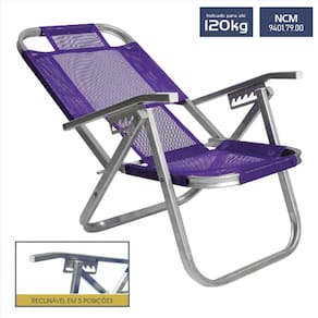 Cadeira de Praia Reclinável Alta Ipanema Roxa CAD0394 Botafogo A Cadeira de Praia Reclinável Alta Ipanema Roxa é a escolha definitiva para quem busca conforto, design e durabilidade em seus momentos de lazer. Parte do segmento premium da Botafogo Lar & Lazer, a cadeira Ipanema se tornou a queridinha dos cariocas e está presente em diversas praias do Rio de Janeiro. Ideal para quem valoriza um produto 100% nacional e sustentável, a cadeira oferece praticidade e um toque de sofisticação à beira-mar. Com estruturas de alumínio retangular, reforçada para garantir resistência e leveza, e assento em tela de PVC Sannet, ela proporciona o máximo de conforto e durabilidade. A cadeira é dobrável e reclinável em até 5 posições, permitindo o ajuste perfeito para seu descanso, seja para relaxar ou curtir o sol com estilo. Especificações: Medidas da Cadeira Aberta:Largura do Assento: 44 cmAltura do chão ao assento : 34 cmAltura do Encosto: 67 cmMedidas quando fechada:Comprimento x Largura x Altura L x C x H : 58 x 9,5 x 82,5 cmPeso: 2,70 kgCapacidade Máxima: 120 kgCor: Roxa de 3 meses fornecida pelo fabricante. Imagens meramente ilustrativas. Código Interno: 230656 Modelo: CAD0394 EAN: 7908155402065 Marca: Não Informado