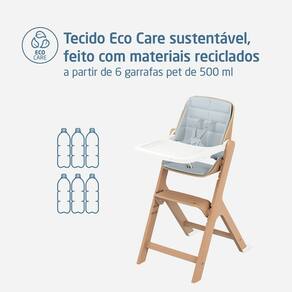 A Cadeira de Refeição Nesta une conforto, segurança e design atemporal para acompanhar o crescimento do bebê desde os 6 meses, com o Kit Baby & Toddler, até a fase adulta. Seu estilo moderno e versátil harmoniza com qualquer ambiente, oferecendo praticidade no dia a dia da família.\n \nProduzida em madeira de faia com tecido Eco Care, feito 100% de garrafas PET recicladas, a Nesta proporciona durabilidade, resistência e toque agradável. O assento ajustável em três alturas, o apoio para os pés com regulagem e o encosto reclinável garantem conforto e postura adequada em todas as fases de uso.\n \nSustentável e funcional, a Nesta possui revestimento impermeável e lavável à máquina, acabamento liso e estrutura ergonômica que acompanha o crescimento até a vida adulta. Um produto resistente, bonito e consciente que transforma cada refeição em um momento de bem-estar e conexão.\n \nPrincipais características:\nAcompanha desde os 6 meses até a fase adulta\nInclui Kit Baby & Toddler com bandeja, barra entrepernas e cinto de 5 pontos\nEncosto reclinável com 2 posições e assento com 3 ajustes de altura\nApoio para os pés ajustável em 3 níveis\nEstrutura ergonômica em madeira de faia\nTecido Eco Care 100% reciclado de garrafas PET\nRevestimento impermeável e lavável à máquina\nAcabamento liso, resistente e fácil de limpar\nSuporta até 110 kg\n \nEspecificações técnicas:\nPosições de altura: 3 posições do assento\nEncosto reclinável: 2 posições (uso a partir dos 6 meses)\nBandeja: sim\nPorta-copo: não\nApoio para os pés: ajustável em 3 posições\nDobrável: não\nDesmontável: sim\nCinto de segurança: 5 pontos ajustável\nLimpeza: capa removível e lavável em máquina; estrutura limpar com pano macio\nComposição/material: madeira, poliéster, PU\nPeso do produto: 7,2 kg\nDimensões (A x L x P): 100 x 46 x 72 cm\nRegistro Inmetro: 002354/2025\n \nImagens meramente ilustrativas. As cores podem variar entre as imagens e o produto.
