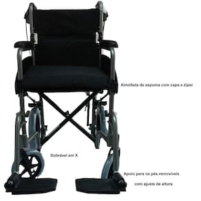 - Estrutura reforçada em alumínio. - Cadeira dobrável em X simples. - Encosto dobrável. - Capacidade de até 100 kG. - Possui bolsa para guardar objetos durante o uso. - Freios bilaterais em alumínios nas rodas traseiras. - Rodas traseiras com aro 12 - Almofada, assento e encosto confortáveis de espuma com revestimento de nylon. - Almofada removível de espuma com capa com zíper. -apoio para os pés removíveis, rebatíveis e articulados com ajuste de altura em 5 níveis de 24 a 34 cm. - Apoio de braço fixos. - Apoio para o calcanhar em nylon. -manoplas em formato anatômico com acionamento fácil dos freios. - Rodas com sistema anti furo em poliuretano. -garfos em alumínio aeronáutico.