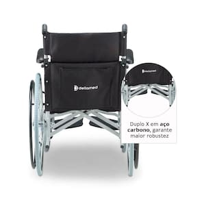 Cadeira dobrável com sistema em duplo X, de fácil transporte; Pintura epóxi martelada de alta resistência; Chassi tubular robusto e resistente de aço carbono; Estofamento em nylon acolchoado; Apoios de braços almofadados ergonômicos e confortável; Freios bilaterais reguláveis e ergonômicos; Possui tiras de panturrilha; Melhor custo-benefício da categoria; Apoio para pés rebatível com regulagem de altura; Pneus frontais e traseiros anti-furo, maciços e rígidos; Rodas frontais de 8 polegadas em ABS; Bolsão traseiro para guardar objetos/prontuário; Protetor lateral de roupas integrado; Possui sistema tip Assist (auxílio de pé para desnível/subidas); Encosto removível, trazendo maior praticidade para seu usuário.
