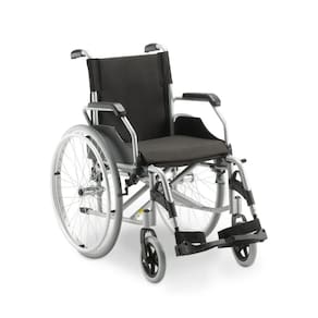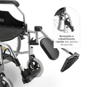 -Composição: Estrutura alumínio dobrável em duplo X, pintura epóxi com as partes têxteis em Nylon e apoio de braços em PVC. -Cor: Pintura da estrutura em cinza e partes têxteis em preto. -Não possui cinto de segurança e nem anti tombo; mas pode ser comprado separadamente. -Possui braços e pernas escamoteáveis, pedal com ajustes de altura, encosto fixo e quick release nas rodas traseiras. -Possui pneu traseiro e dianteiro rígido anti furo. -Rodas traseiras com raios em aço e aro de propulsão em alumínio.