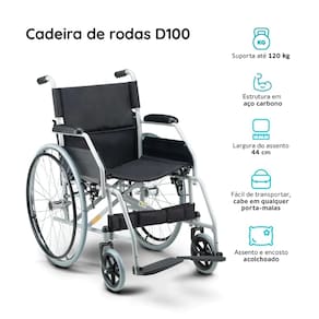 Além disso, a cadeira de rodas D100 possui uma estrutura dobrável, equipada com o sistema em duplo X, garantindo praticidade no transporte e armazenamento.