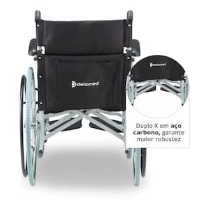 Suporta até 120 kg; Vai com você para todo lugar: cabe em qualquer porta-malas, inclusive de carros mais compactos Assento e encosto acolchoado; Aro de propulsão em aço carbono, ultraresistente; Duplo X em aço carbono garante maior robustez; Possui registro na Anvisa e é certificada pelo Inmetro.
