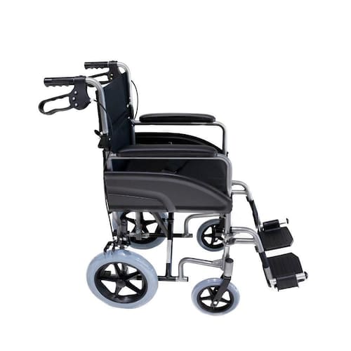 Capacidade de peso: 100kgs Rodas traseiras aro 12; Almofada de espuma revestida em nylon; Estrutura reforçada em alumínio; Dobrável com x simples; Encosto dobrável; Assento e encosto em nylon resistente; Apoio para os pés rebatíveis, articulados, removíveis, com ajuste de altura; Apoio de braços fixos Faixa de nylon para o apoio do calcanhar; Rodas dianteiras e traseiras em pu, com sistema anti-furo; Garfos em alumínio aeronáutico; Freios em alumínio, bilaterais, nas rodas traseiras; Bolsa para objetos na parte de traseira do encosto; Manoplas anatômicas com freio para condutor; Com registro inmetro e anvisa