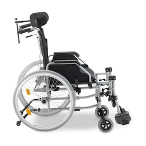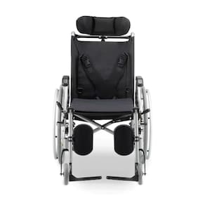 -Estrutura: Alumínio dobrável com pintura cinza -Reclinação: Encosto reclinável em 4 níveis de inclinação (110°, 120°, 135° e 150°) -Rodas: Traseiras 24" com aro de propulsão em alumínio + dianteiras 6" maciças -Apoios: Cabeça ajustável, pés com regulagem de altura, braços e pernas escamoteáveis -Segurança: Cinto torácico, rodas rígidas anti-furo e apoio de panturrilha