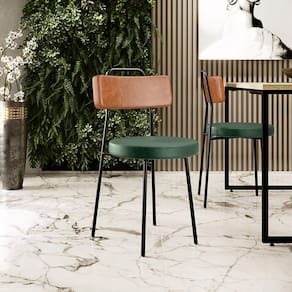 Revestimento do encosto em Couríssimo na cor Camel e do assento em Facto na cor Verde Musgo, com acabamento semi brilho.