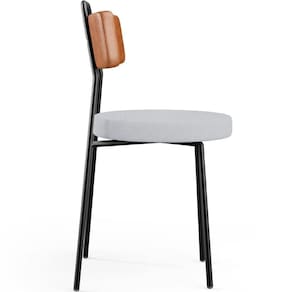 Revestimento do encosto em Couríssimo na cor Camel e do assento em Linho na cor Cinza, com acabamento semi brilho.