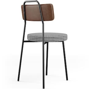 Revestimento do encosto em Couríssimo na cor Marrom e do assento em Veludo na cor Pied Poule, com acabamento semi brilho.