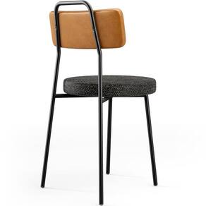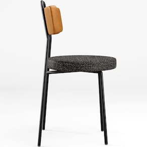 Revestimento do encosto em Couríssimo na cor Whisky e do assento em Linho na cor Chumbo, com acabamento semi brilho.