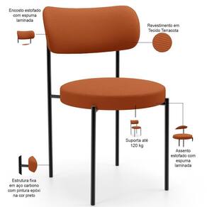 Altura da cadeira: 80 cm | Altura do assento a partir do solo: 47 cm | Color: Laranja | ColorFamily: Laranja | ColorSimple: Laranja | ColorSupplier: Terracota | Cor: Terracota | Cor da estrutura da cadeira: Preto | Cor do assento: Terracota | Cor do estofamento: Terracota | Desenho do tecido: Tecido | É cadeira de balanço: Não | É dobrável: Não | É empilhável: Não | Espessura do assento: 6 cm | Fabricante: Lyam Decor | Firmeza: Firme | Largura da cadeira: 50 cm | Largura do assento: 46 cm | Material: Tecido, Aço | Material do estofamento: Tecido | MaterialFamily: Tecido, Aço | Model: Louise | OriginCountry: | OriginState: PR | Peso máximo suportado: 120 kg | ProductContents: 01 Cadeira | ProductHeight: 50 cm | ProductInstructions: Produto para uso em ambiente interno, nao devendo ficar exposto ao sol, calor e umidade excessivos. | ProductLength: 80 cm | ProductWarranty: 90 dias após o do produto | ProductWeight: 5,7 kg | ProductWidth: 53 cm | Profundidade da cadeira: 53 cm | Profundidade do assento: 34 cm | Requer montagem: Não | SizeDescription: Altura: 53 cm x Largura: 50 cm x Profundidade: 80 cm | SupplierSimpleName: Cadeira Decorativa Estofada Para Sala De Jantar Louise L02 Tecido Terracota - Lyam Decor | Tempo de montagem: na
