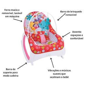 A cadeira apresenta função musical, vibra para ninar e ainda traz divertidos e fofos brinquedos para serem pendurados no arco. A cadeirinha é fundamental para ajudar no dia a dia das mamães que precisam realizar inúmeras tarefas, pois relaxa e entretém o bebê durante todo o dia e garantindo seu conforto. Tudo pensado para o deixar mais tranquilo, relaxado e feliz!