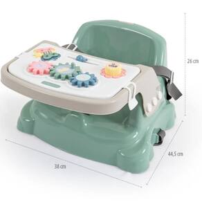 Equipada com uma central de atividades removível repleta de elementos sensoriais, a cadeira estimula a coordenação motora e a curiosidade, com peças interativas que encantam. A bandeja de alimentação, também removível, permite refeições práticas à mesa, enquanto a trava anatômica nas pernas e dois cintos de segurança um para fixar a cadeira e outro para o bebê garantem proteção total. Seu design em verde neutro combina com qualquer ambiente, trazendo versatilidade e charme. Indicada para crianças a partir de 12 meses, suporta até 25kg e promove momentos de alegria e crescimento.