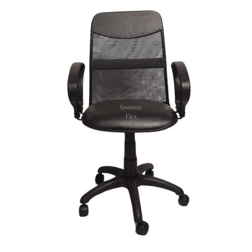 Cadeira Diretor - braço fixo - estrutura do encosto em aço, revestida em tecido tela com faixa e detalhe em corano - assento em madeira reflorestada - espuma injetada, revestida em couro sintético e bordas em pvc flexivel, mecanismo relax , que permite o inclinamento do encosto, base estrela em nylon com rodizio - regulagem de altura a gás. Marca: Sintonia Flex