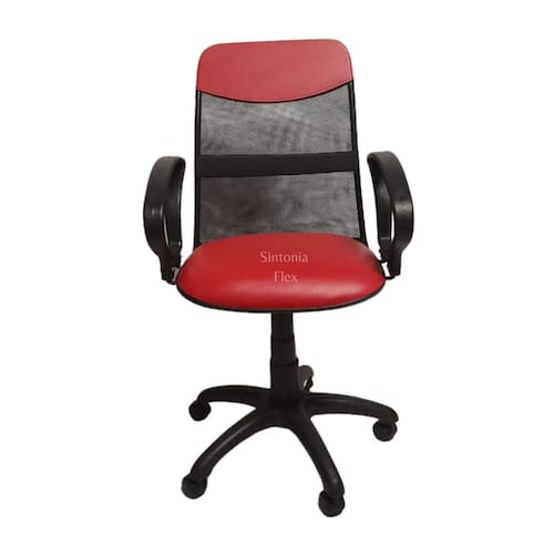 Cadeira Diretor - braço fixo - estrutura do encosto em aço, revestida em tecido tela com faixa e detalhe em corano - assento em madeira reflorestada - espuma injetada, revestida em couro sintético e bordas em pvc flexivel, mecanismo relax , que permite o inclinamento do encosto, base estrela em nylon com rodizio - regulagem de altura a gás. Marca: Sintonia Flex