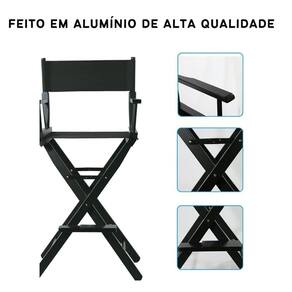 Especificações: - cor: preto - material: alumínio estrutura e nylon assento e encosto - dimensões do assento: 58x42cm largura x profundidade - limite de peso máximo: 180 kg; - altura até o assento: 75 cm; - altura máxima até o encosto de cabeça: 140cm cm; - peso do produto: 5,5kg - acompanha: cadeira diretora/maquiadora, encosto para cabeça, apoio para o pés, bolsa de transporte