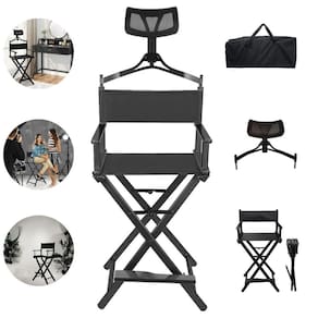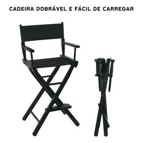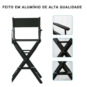 Especificações: - cor: preto - material: alumínio estrutura e nylon assento e encosto - dimensões do assento: 58x42cm largura x profundidade - limite de peso máximo: 180 kg; - altura até o assento: 75 cm; - altura máxima até o encosto de cabeça: 140cm cm; - peso do produto: 5,5kg - acompanha: cadeira diretora/maquiadora, encosto para cabeça, apoio para o pés, bolsa de transporte