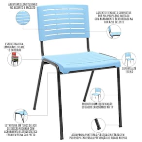 Color: Azul Celeste | ColorFamily: Azul | ColorSimple: Azul | ColorSupplier: Azul Celeste | Com apoio de braços: Não | Com aro para pés: Não | Com rodas: Não | Cor: Azul Celeste | Formato de venda: Unitário | Materiais do aro para pés: na | Material: Termoplástico, Tubos de Aço | Material do estofamento: na | MaterialFamily: Polipropileno | Model: Kimi | Modelo: Kimi | Modelo detalhado: Kimi | OriginCountry: Brasil | OriginState: PR | ProductContents: 01 Cadeira | ProductHeight: 79 cm | ProductInstructions: Produto para uso em ambiente interno, nao devendo ficar exposto ao sol, calor e umidade excessivos. | ProductLength: 56 cm | ProductWarranty: 90 dias após o recebimento do produto | ProductWeight: 4 kg | ProductWidth: 44 cm | Requer montagem: Não | SizeDescription: Altura: 79 cm x Largura: 44 cm x Profundidade: 56 cm | SupplierSimpleName: Cadeira Empilhável Fixa Escritório Multiuso Base Preta Kimi P03 Azul Celeste - Lyam Decor | Tipo de cadeira de escritório: Cadeira Empilhável
