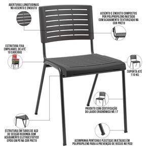 Assento e encosto compostos por polipropileno injetado com acabamento texturizado na cor Preto.