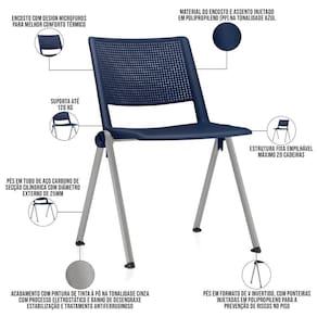 Material do encosto e assento injetado em Polipropileno (PP) na tonalidade Azul.