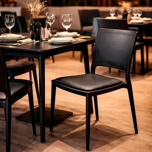 Seu assento estofado revestido em vinil preto proporciona maior conforto, tornando a experiência de uso ainda mais agradável, mesmo por longos períodos. O design moderno e elegante combina facilmente com diferentes estilos de ambientes, sendo ideal para salas de jantar, cozinhas, áreas gourmet, escritórios, restaurantes, salões e eventos.
