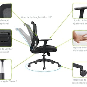 Cadeira em Ergonômica de escritório em Mesh com encosto de lombar em moldura preta; Parte traseira de nylon com estofamento de malha de excelente qualidade com suporte lombar ajustável; Assento estofado em tecido elástico de ótima qualidade com espuma moldada; Apoio de braço ajustável com apoio em PU; Mecanismo de alavanca com inclinação e travamento na função de 3 posições; Elevação á Gás preto 5.100/50mm, classe 3; Base de nylon; Rodinhas em Nylon com Revestimento em PU Produto Montado: Sim Ambiente Principal: Escritório codigo_ean: 7909903943472 Complexidade da Montagem: Baixa: pode ser montado por uma pessoa sozinha Cor: Preto Cor do Produto: Preto Empilhável: Não Enchimento do Assento: Espuma Encosto Reclinável: Sim Itens Inclusos: 1 Cadeira (Desmontada), Manual para Montagem Ferramentas e Parafusos Manual de Montagem e Instalação: https://product-hub-prd.madeiramadeira.com.br/953715/documents/17b34a2c-6831-4d95-b3f0-5eed445fcd9136421727289700953715113509.pdf Necessita Montagem: Sim Origem do Produto: Importado Peso: 15 kg Possui LED: Não Possui Rodízio: Sim Recomendações de Uso, Manutenção e Limpeza: Não Utilizar Produtos Químicos ou Abrasivos Evite Incidência Direta de Luz Solar Evitar Batidas e Contato com Objetos Cortantes Limpeza com Flanela Úmida ou Esponja não Abrasiva Não Deve Ficar em Local Exposto a Sol e Chuva Sistema de Montagem: Parafusos Suporta Até (kg): 230 kg undefined: 953718 Marca: Movescan