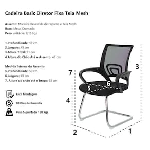 Cadeira Escritório Basic Diretor Fixa Tela Mesh Preta Base Cromada Modelo: Cadeira Escritório Basic Diretor Tela Mesh Preta Assento: Madeira Revestida de Espuma e Acabamento em Tela Mesh Base: Metal Cromado Profundidade: 59 cm Largura: 49 cm Altura Total: 91 cm Altura do Chão Até o Assento: 45 cm Altura do Chão Até o Braço: 63 cm Medida Interna do Assento Profundidade 50 cm Largura 49 cm Peso Máx. Recomendado: 120 kgs Peso unitário: 8,15 kgs