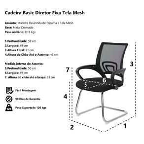 Cadeira Escritório Basic Diretor Fixa Tela Mesh Preta Base Cromada Modelo: Cadeira Escritório Basic Diretor Tela Mesh Preta Assento: Madeira Revestida de Espuma e Acabamento em Tela Mesh Base: Metal Cromado Profundidade: 59 cm Largura: 49 cm Altura Total: 91 cm Altura do Chão Até o Assento: 45 cm Altura do Chão Até o Braço: 63 cm Medida Interna do Assento Profundidade 50 cm Largura 49 cm Peso Máx. Recomendado: 150 kgs Peso unitário: 8,15 kgs