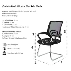 Cadeira Escritório Basic Diretor Fixa Tela Mesh Preta Base Cromada Modelo: Cadeira Escritório Basic Diretor Tela Mesh Preta Assento: Madeira Revestida de Espuma e Acabamento em Tela Mesh Base: Metal Cromado Profundidade: 59 cm Largura: 49 cm Altura Total: 91 cm Altura do Chão Até o Assento: 45 cm Altura do Chão Até o Braço: 63 cm Medida Interna do Assento Profundidade 50 cm Largura 49 cm Peso Máx. Recomendado: 150 kgs Peso unitário: 8,15 kgs