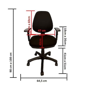 - Altura total: 109 a 119 cm. - Altura do assento ao chão: 47 a 57 cm. - Altura do apoio de braço ao assento:17 a 25 cm. - Profundidade assento: 45 cm. - Largura total: 68 cm. - Altura do encosto: 63 a 69 cm. - Largura do assento: 50 cm. - Largura do apoio de braço: 8 cm