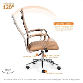Encosto alto estilo esteirinha com costura horizontal Sistema relax com inclinação suave e trava de Rodízios de silicone que protegem o piso e deslizam com leveza Base giratória cromada com regulagem de altura a gás Revestimento em couro PU com toque agradável e fácil limpeza Apoio de braços cromado com cobertura acolchoada Design elegante, inspirado na linha Charles Eames Peso máximo recomendado: 100 kg Perguntas Frequentes