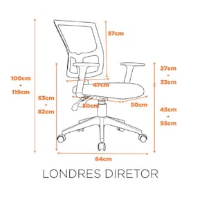 A cadeira Londres Diretor por ser ergonômica ela é ideal para trabalhar, seja no escritório ou em casa! Ela é totalmente ajustável, seus braços, assento e encosto. Isso fará a cadeira se adaptar a pessoa que está usando. Seu assento em espuma injetada é muito confortável também, e seu encosto em tela com apoio de lombar, evitarão suas dores nas costas! Altura do assento até o chão: 55 cm Ambiente Principal: Escritório Apoio para Braços Estofado: Não Braço com Ajuste de Altura: Sim Complexidade da Montagem: Média: pode ser montado por mais de uma pessoa e/ou necessite de maior conhecimento para montagem Cor: Preto Cor da Base: Preto Cor do Produto: Preto Dobrável: Não Empilhável: Não Encosto Reclinável: Sim Escala de Brilho: Fosco Estrutura do Encosto: Polipropileno Giratória: Sim Informações Complementares: Possui Efeito Relax com travamento Itens Inclusos: 01 Cadeira, Kit Ferragens, Manual de Montagem Linha ou Coleção: Londres Diretor Manual de Montagem e Instalação: https://cdn2.madeiramadeira.com.br/atributo/fratini/1219364-londres-diretor.pdf Material da Base: Nylon Necessita Montagem: Sim Origem do Produto: Importado Peso: 13 kg Possui Apoio para Braços: Sim Possui Apoio Para os Pés: Não Possui LED: Não Possui Rodízio: Sim Recomendações de Uso, Manutenção e Limpeza: Pano úmido Revestimento do Assento: Espuma injetada Revestimento do Encosto: Tela Especial Sistema de Montagem: Encosto / Assento / Par de Braços / Flange (Mecanismo) / Pistão / Capa Telescópica / Rodizio (Estrela + Rodinhas) / Kit de Parafusos + Chave de Parafusos Suporta Até (kg): 150 kg Tipo de Assento: Fixo Tipo de Encosto: Regulável