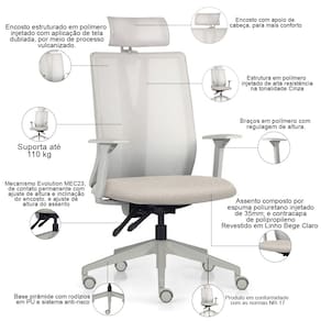 Peso máximo suportado 110 kg, com uso recomendado de 8 horas diária.