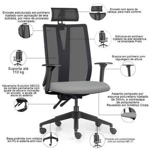 Color: PretoCinza | ColorFamily: Preto | ColorSimple: Preto | ColorSupplier: PretoCinza | Com apoio de braços: Sim | Com aro para pés: Não | Com rodas: Sim | Cor: PretoCinza | Formato de venda: Unitário | Materiais do aro para pés: na | Material: Polímero injetado, espuma injetada, tela dublada vulcanizada, rodízios em PU, revestimento em Sintét | Material do estofamento: Espuma Injetada em Poliuretano 35mm | MaterialFamily: Polímero | Model: Flow Presidente | Modelo: Flow Presidente | Modelo detalhado: Flow Presidente | OriginCountry: Brasil | OriginState: PR | ProductContents: 01 Cadeira de Escritório | ProductHeight: 111 cm | ProductInstructions: Produto para uso em ambiente interno, nao devendo ficar exposto ao sol, calor e umidade excessivos. | ProductLength: 71 cm | ProductWarranty: 90 dias após o recebimento do produto | ProductWeight: 13 kg | ProductWidth: 71 cm | Requer montagem: Sim | SizeDescription: Altura: 111 cm x Largura: 71 cm x Profundidade: 71 cm | SupplierSimpleName: Cadeira Escritório Giratória Presidente Flow F02 Base Preta Sintético Cinza - Lyam Decor | Tipo de cadeira de escritório: Presidente Giratória