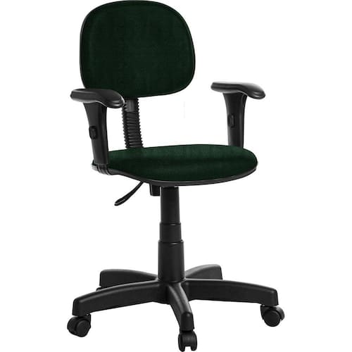 Cadeira de Escritório Giratória Secretária com BraçoIdeal para ambientes como: Escritórios, Corporativo, Home Office, Consultórios, etc. Especificações: Revestimento:Cor do Revestimento: Verde.Tipo de Revestimento: Crepe.Malha: 100% Poliéster;Composição Química: Polímero pertencente ao grupo de resinas sintéticas; Detalhamento do Assento:Espuma Injetada de Poliuretano; Largura 425 mm X Espessura 50 mm X Profundidade 385 mm; Detalhamento do Encosto:Espuma Injetada de Poliuretano;Largura 365 mm X Espessura 40 mm X Altura 295 mm; Componentes da Base Giratória:Flange em aço Preta;Estrela em Aço com Capa Preta;Rodízios em Nylon;Pistão a gás Preto, permite regulagem da altura;Base possui raio externo de 285 mm, raio útil de 262,5 mm;Parafusos Philips para Montagem; Dimensões e Peso montado:Altura do assento referente ao piso, miníma 420 mm, máxima 530 mm;Altura do topo do braço referente ao piso, mínima 590 mm, máxima 710 mm;Peso aproximado: 10,8 kg;Peso suportado: 110 kg Uniformemente Distribuídos; Dimensões da Caixa:Largura 590 mm X Profundidade 580 mm X Altura 200 mm; Componentes Inclusos: 01 Assento Secretaria; 01 Encosto Secretaria; 01 Suporte de Encosto com Capa Preto; 01 Pistão com Capa Preta; 01 Estrela em Aço com Capa Preta; 05 Rodízios Nylon Preto; 02 Braços Reguláveis Pretos; Parafusos para montagem ¼ Philips; Manual de Montagem. Montagem: A montagem deve ser realizada pelo cliente seguindo o manual de montagem.Garantia: 180 dias contra defeitos de fabricação, previstos em Lei;Obs: Pode haver variação de tonalidade referente ao lote do revestimento e a resolução de Computadores e Smartfones.