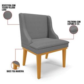 Os melhores momentos que passamos com a nossa família e amigos são ao redor da mesa durante as refeições, por isso, a escolha da cadeira é tão importante. Além de compor a decoração do ambiente, ela precisa ser confortável e resistente, assim como a Cadeira Estofada Lia que suporta até 120 kg, conta com estrutura ecologicamente correta em madeira de eucalipto proveniente de reflorestamento e base fixa em madeira, que agrega qualidade e durabilidade ao produto. Todo o conforto vem da espuma de densidade D-23 e do tecido do assento e do encosto. O revestimento desse móvel incrível é em Veludo, tecido nobre e envolvente que traz a sensação de aconchego, possui fibras altamente resistentes, macio ao toque, de fácil limpeza, propicia luxo e elegância ao ambiente.
