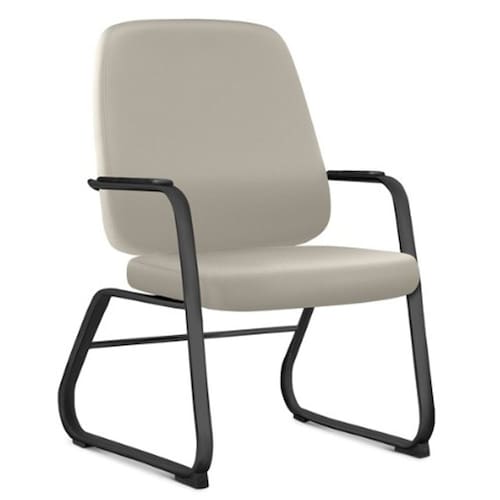 Apoio de braços em poliuretano integral skin, fixo com textura e com borda curvada para baixo, para melhor conforto.
