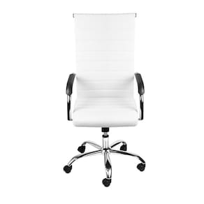 Cadeira Florença Alta Branca em Couro Sintético Base Rodízio possui Assento e encosto em PU, com base cromada giratória, sistema relax e rodízios em PU que não riscam o piso.. Medidas: Altura do chão ao assento: 42 a 51cm / altura do chão ao braço: 62 a 70,5cm / Altura do chão ao encosto: 106 a 113,5cm / Largura: 54cm / Comprimento: 48cm
