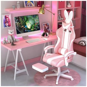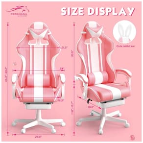 Cadeira de jogos Kawaii para meninas Equipada com orelhas de coelho branco e pelúcia, a cadeira de jogos para meninas Ferghana fica muito adorável e especial. Você pode ajustar o ângulo de dobragem das orelhas de coelho à vontade ou retirá las e usá las. A cadeira de jogo fofa dará um toque agradável à sua sala de jogos. Cadeira de jogos ergonômica A cadeira de jogos para PC foi projetada de acordo com a curva da coluna humana. A combinação do encosto, do apoio de cabeça e do travesseiro lombar se encaixa na curva do corpo do jogador, o que aliviará efetivamente a pressão das costas e permitirá que o jogador se concentre mais no jogo. Recursos multi ajustáveis para atender às suas demandas 1. Encosto de cabeça ajustável e travesseiro lombar de massagem 2. Trancado em qualquer ângulo entre 90 e 135 3. Rodas rotativas suaves 4. 360 giratório 5. Apoio para os pés retrátil 6. altura de 4 polegadas ajustável. 7. Apoios de braços de ligação. Presente de Natal fácil de montar Todos os parafusos são pré instalados na cadeira de jogos de computador, portanto, geralmente leva apenas 15 minutos para ser montado, se você seguir o manual. É um presente de Natal ideal para a garota do jogador. Controle de qualidade rigoroso A cadeira de jogo reclinável é composta por um módulo de esqueleto de corrida premium que pode suportar até 113 kg. A base de aço à prova de explosão de alta resistência e o cilindro de três níveis certificado pela SGS constroem uma forte linha de segurança.