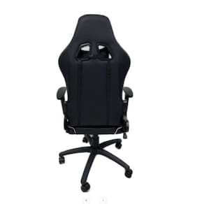 Especificações: Medidas do encosto: 50 cm de largura x 83 cm de altura / A cadeira atinge uma altura mínima de 127 cm x máxima de 135 cm. / Metal reforçado 1,2 mm de espessura / Assento: 37 cm de largura Composição: Couro sintético, espuma branca 24D, espuma moldada, nylon, metal Inclinação: 90 Ajustes: Altura e reclinação Elevação: A gás Classe 3 (100 mm) Base: PP de 320 mm Cor: Preta com detalhes branco Peso: 14 kg