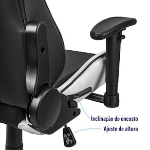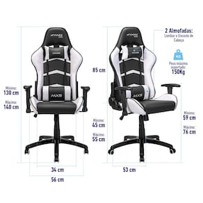 Características Marca: Mymax Nome produto: Cadeira Gamer MX5 Giratoria Preto/Branco Modelo: Cadeira Gamer MX5 Cor: Preto/Branco Revestimento: Estofamento em tecido sintético PU Estrutura: Metálica Superfície de Apoio: Espuma com densidade controlada - 35 Assento / 22 Encosto Peso Máximo Suportado: 150kg Ajuste Altura: Sim - 10cm Encosto Regulável: Sim - Permite inclinação de até 180° Função Balanço: Sim - Função de balanço permite inclinar o assento em até 12° Gás: Classe 3 - 100mm Diâmetro Pés: 70cm Rodas: 50mm Braços: Regulagem 2D (direita/esquerda e altura) Almofadas: Almofadas para apoio lombar e de pescoço. Ambas com logo bordado Parafusos: 14 Altura do chão até apoio de braço: 59 - 76cm Altura do chão até assento: 45 - 55cm Altura do encosto: 85cm Largura do assento: Interna 34cm / Externa 53cm Profundidade interna do assento: 53cm EAN: 7898554984098 Informativo de Garantia: 12 meses de garantia (9 meses de garantia contratual junto ao fabricante + 3 meses referentes à garantia legal, nos termos do artigo 26, II, do Código de Defesa do Consumidor)
