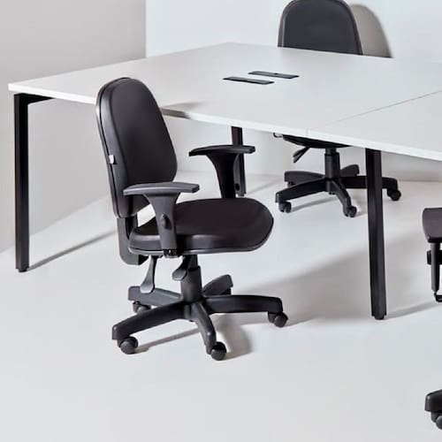 Cadeira giratória modelo executiva de espaldar médio com assento e encosto estruturado em madeira laminada e estofado com espuma injetada com densidade D45.